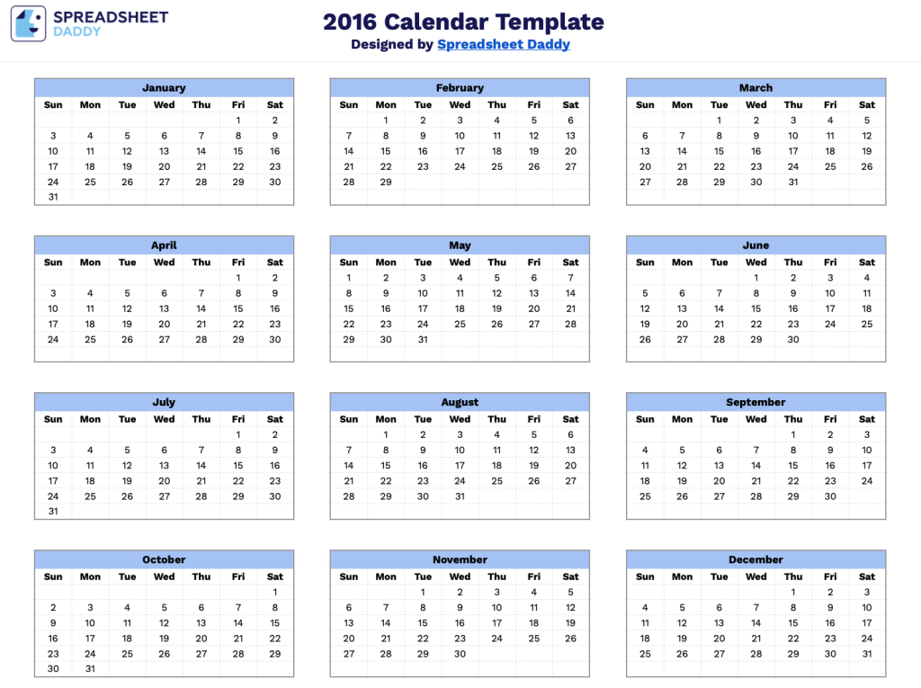 Free☝️ 2016 Calendar Template (Google Sheets, Excel, & PDF Downloads)