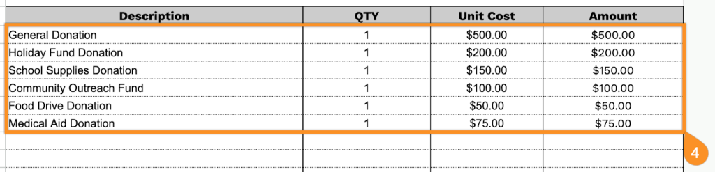 • Itemized donation tracking table: A table with four columns (Description, QTY, Unit Cost, Amount) enables you to document multiple donation types, whether cash contributions, in-kind donations, or donated goods, providing detailed breakdowns required for tax documentation purposes.