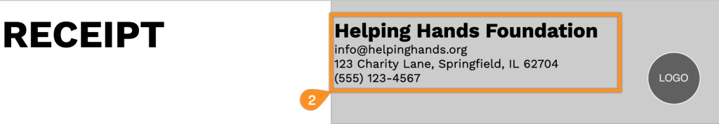 2. Add your organization’s information at the top of the receipt. This should include the nonprofit’s name, address, mailing address, phone number, and logo, so donors can easily identify your 501(c)(3).