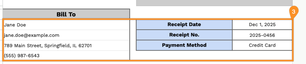 3. Enter the donor’s details in the Bill To section, along with the receipt date, receipt number, and the payment method used for the donation.