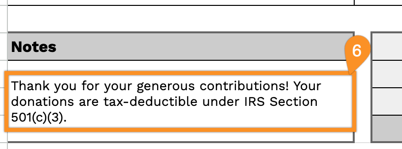 6. Use the Notes section for any additional information, such as tax-deductible statements or special acknowledgments related to the donor’s contribution.
