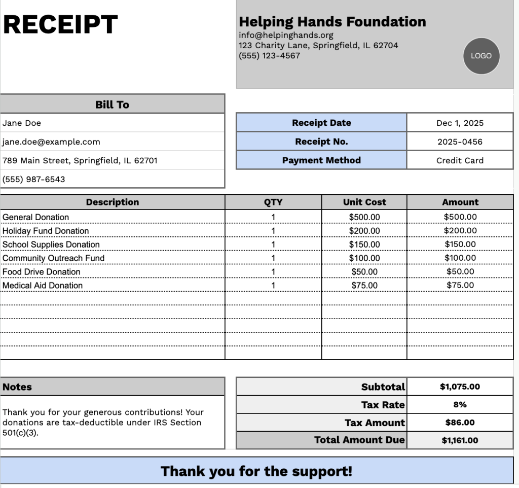• Donor information panel: A “Bill To” section captures complete donor details, including name, email, physical address, and phone number, along with essential tracking fields for receipt date, receipt number, and payment method to maintain accurate donor records and IRS compliance.