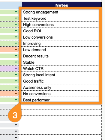 - Status and Notes fields for campaign lifecycle management: The final two columns, Status and Notes, provide a built-in workflow system for flagging each campaign as active, paused, or completed, while the open-ended Notes field gives you space to log strategy changes, observations, or next steps directly alongside the relevant campaign data.