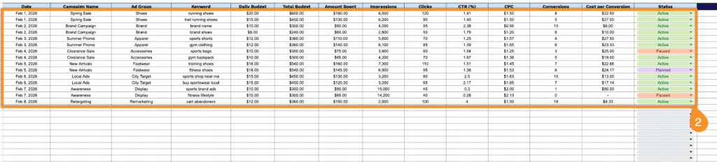 - Built-in performance metric fields for real-time analysis: Core KPI columns, including Impressions, Clicks, CTR (%), CPC, Conversions, and Cost per Conversion, are built directly into the row structure, allowing you to track ad performance and calculate efficiency metrics alongside your spend data without needing a separate reporting tool.