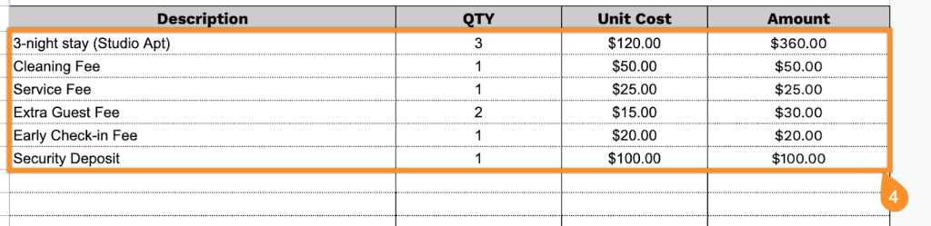 - Itemized billing table with 11 line items: A comprehensive table featuring four columns (Description, QTY, Unit Cost, Amount) and pre-formatted rows, enabling you to list multiple charges such as nightly accommodation rates, cleaning fees, service charges, extra guest fees, or amenity costs with quantities and unit pricing that calculate to individual line-item amounts.