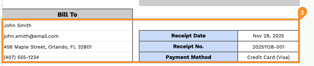 3. Fill in the guest’s information under “Bill To,” along with the receipt date, receipt number, and payment method.