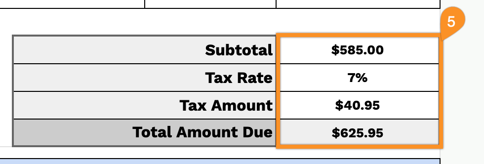 5. Add the applicable tax rate. The template will automatically calculate the subtotal, tax amount, and total amount due.