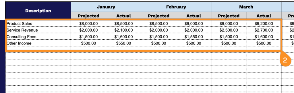 2. Provide detailed descriptions for each transaction and include both projected and actual amounts for every month in the Income and Expenses sections.