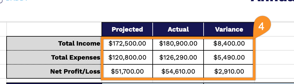 - Summary dashboard with variance analysis: The top section displays three key metrics (Total Income, Total Expenses, and Net Profit/Loss) with Projected, Actual, and Variance columns, providing an at-a-glance view of your annual financial performance and highlighting deviations from your budget plan.