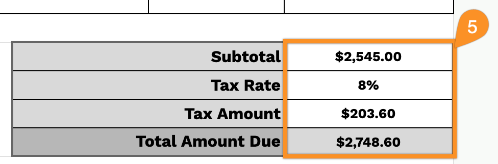 5. Apply the appropriate tax rate. The template will automatically generate the subtotal, tax amount, total due, and any remaining balance.