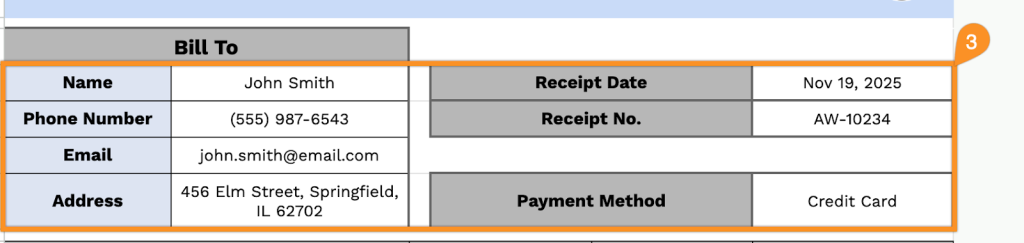 3. Enter the customer’s billing information, along with the receipt date, receipt number, and payment method.
