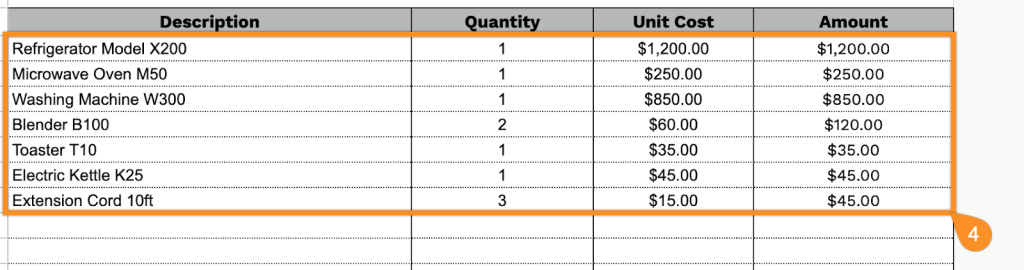 • Detailed itemized purchase table: Pre-formatted table with four columns (Description, Quantity, Unit Cost, Amount) and rows, enabling clear line-by-line documentation of appliances, accessories, installation services, or warranty packages with individual pricing for each item.