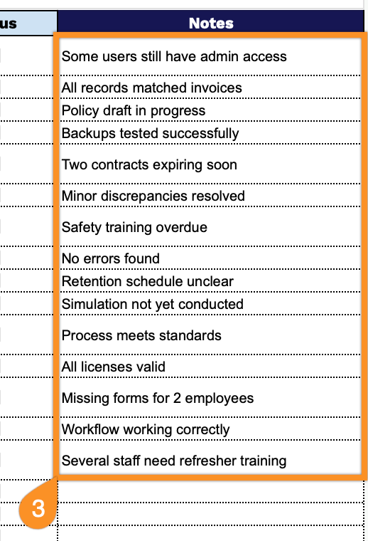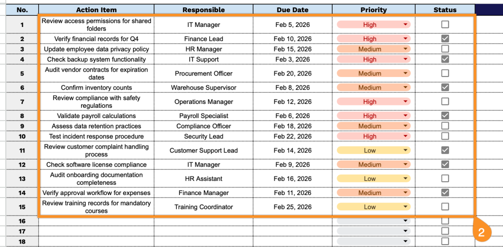 - Interactive checkbox status tracking: The Status column features checkboxes for each audit item, allowing you to quickly mark tasks as complete with a simple click, providing instant visual feedback on audit progress and making it easy to identify outstanding action items at a glance during reviews or follow-up meetings.