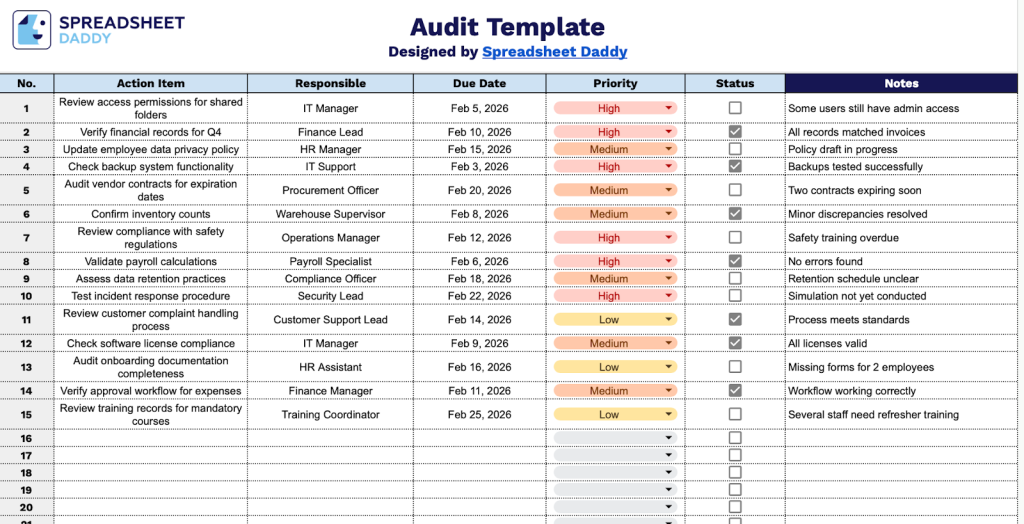 - Structured column framework for accountability: Each audit entry includes six essential data fields that create a complete audit trail, including Action Item for describing the finding or task, Responsible to assign ownership, Due Date for timeline management, Priority to rank urgency, Status to track completion stages, and Notes for additional documentation or corrective action details.