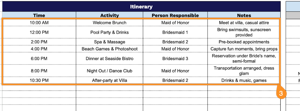- Activity: Describe the planned event, experience, or entertainment for that time slot.