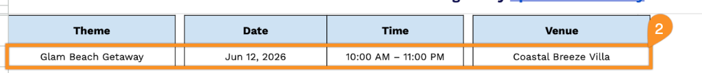 2. Add the bachelorette party details at the top. Choose a theme and fill in the date, time, and venue so everyone is on the same page from the start.