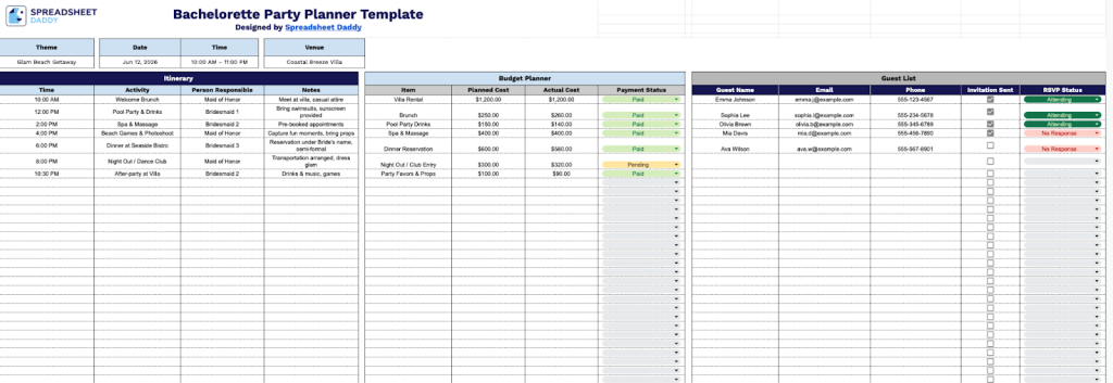 Our Bachelorette Party Planner Template helps you organize every detail of your celebration, from scheduling activities and managing your budget to tracking guest RSVPs.