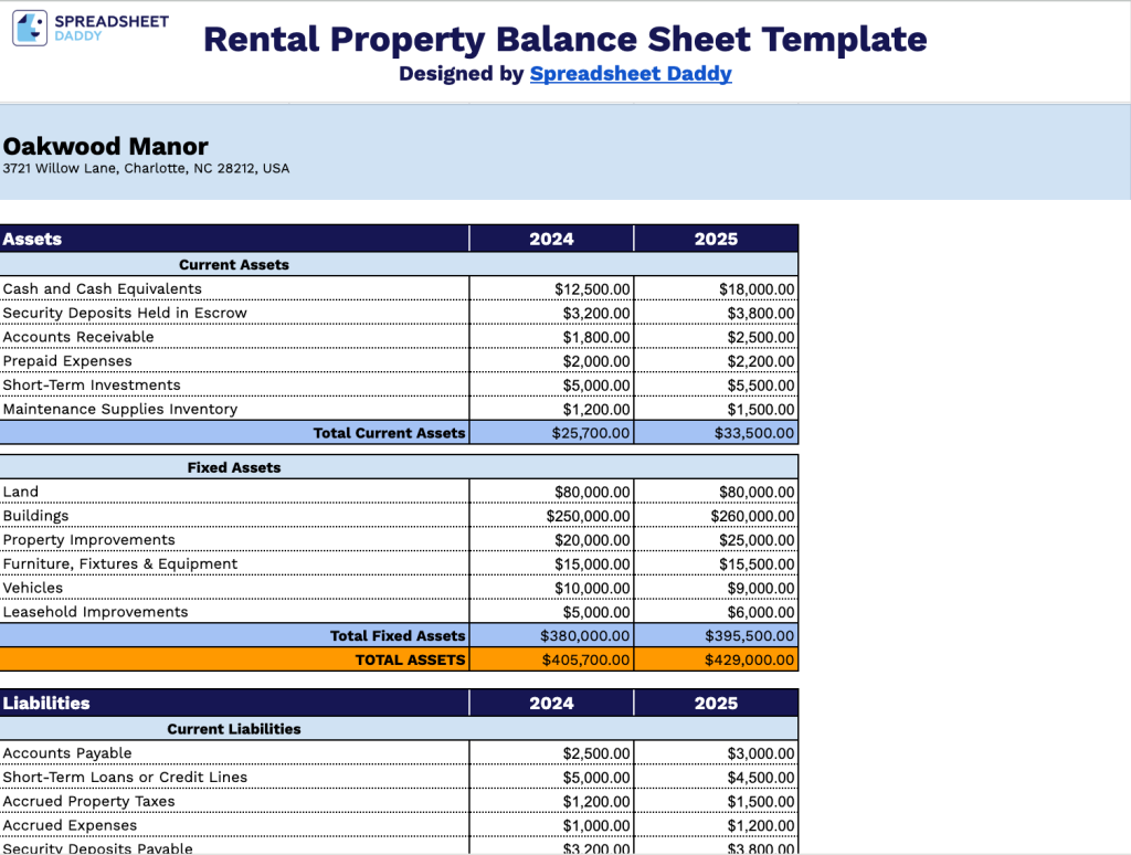 Our Rental Property Balance Sheet Template is tailored specifically for real estate investments with property-specific asset and liability categories.