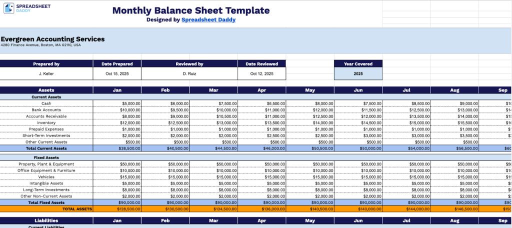 - Asset tracking: Organized sections for Current Assets (cash, receivables, inventory) and Fixed Assets (property, equipment, vehicles) with automatic subtotals rolling into Total Assets.