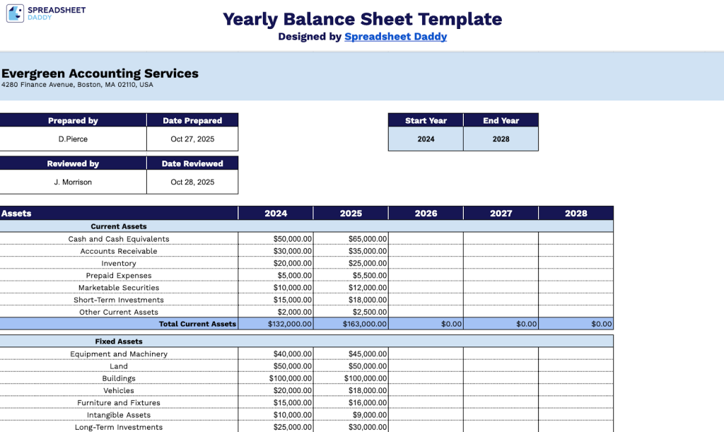 - Two-year asset comparison: Track assets across 2024 and 2025 with side-by-side columns showing year-over-year changes. Assets are divided into Current and Fixed categories with automatic subtotals.