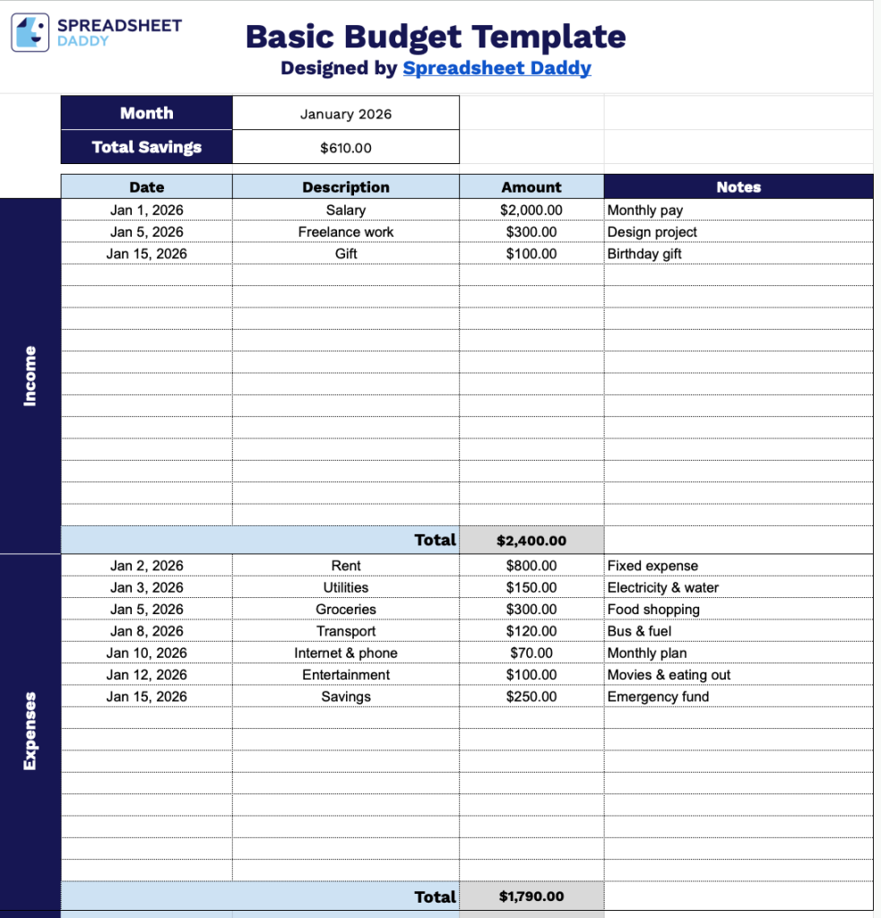 Our Basic Budget Template helps you track your monthly income and expenses in a simple, organized format.