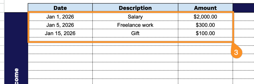 - Date: Enter the exact date when each income is received (e.g., paycheck, allowance) or when an expense is paid (e.g., rent, groceries).