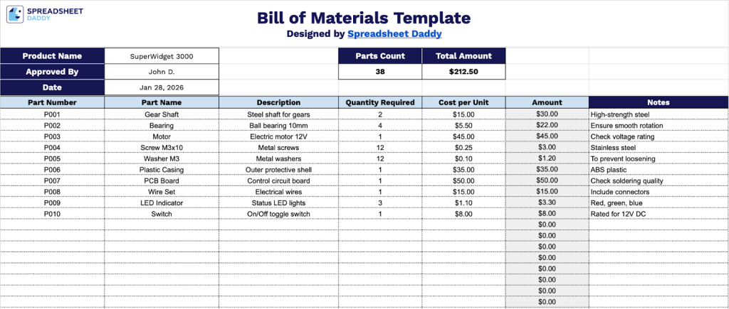 • Comprehensive header section with key project identifiers: The template features customizable fields at the top for Product Name, Approved By designation, and Date stamp, along with automatic counters that display total Parts Count and Total Amount, providing instant visibility into the scope and cost of your bill of materials.