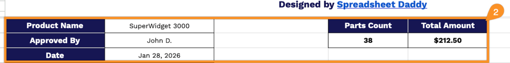 2. Start by entering the final product’s name, who approved it, and the date. As you list each part with its quantity and cost, the template will automatically calculate the total number of parts and the overall amount.