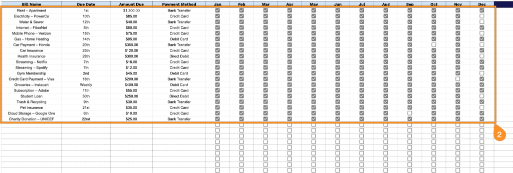 2. Record the name of each bill, when it’s due, how much you owe, your preferred payment option, and track which bills you’ve settled each month.