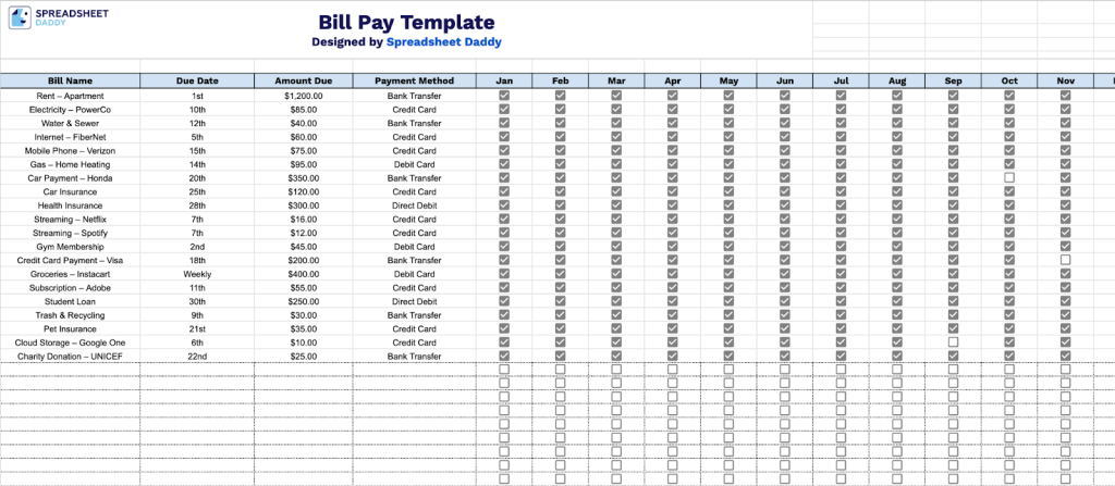Using this kind of spreadsheet makes it easier to stay organized, avoid late fees, and manage your monthly budget more effectively.