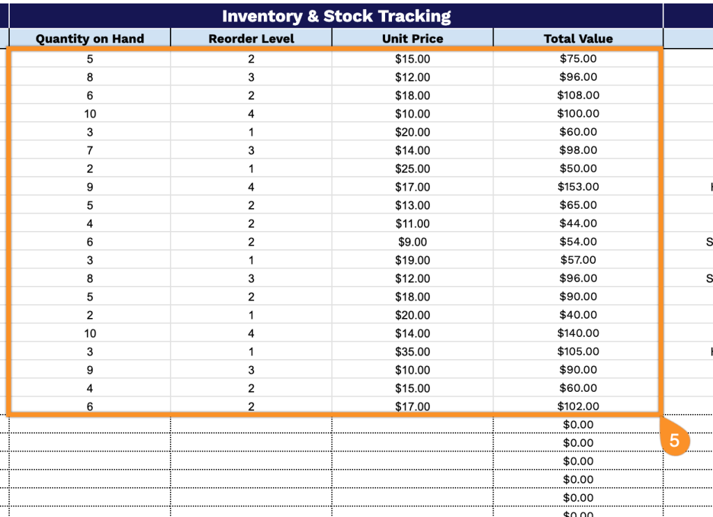- Automated inventory management: Features Quantity on Hand and Reorder Level columns that work together to help maintain optimal stock levels.