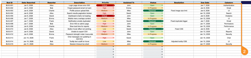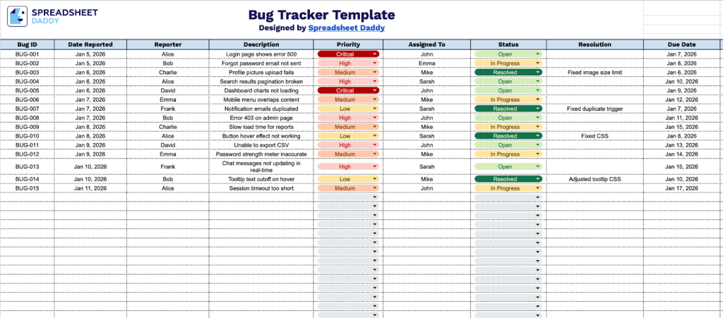 - Detailed resolution documentation: The Resolution column provides space to record how each bug was fixed, creating a valuable knowledge base for future reference and helping teams identify patterns or recurring issues that may require systematic improvements.