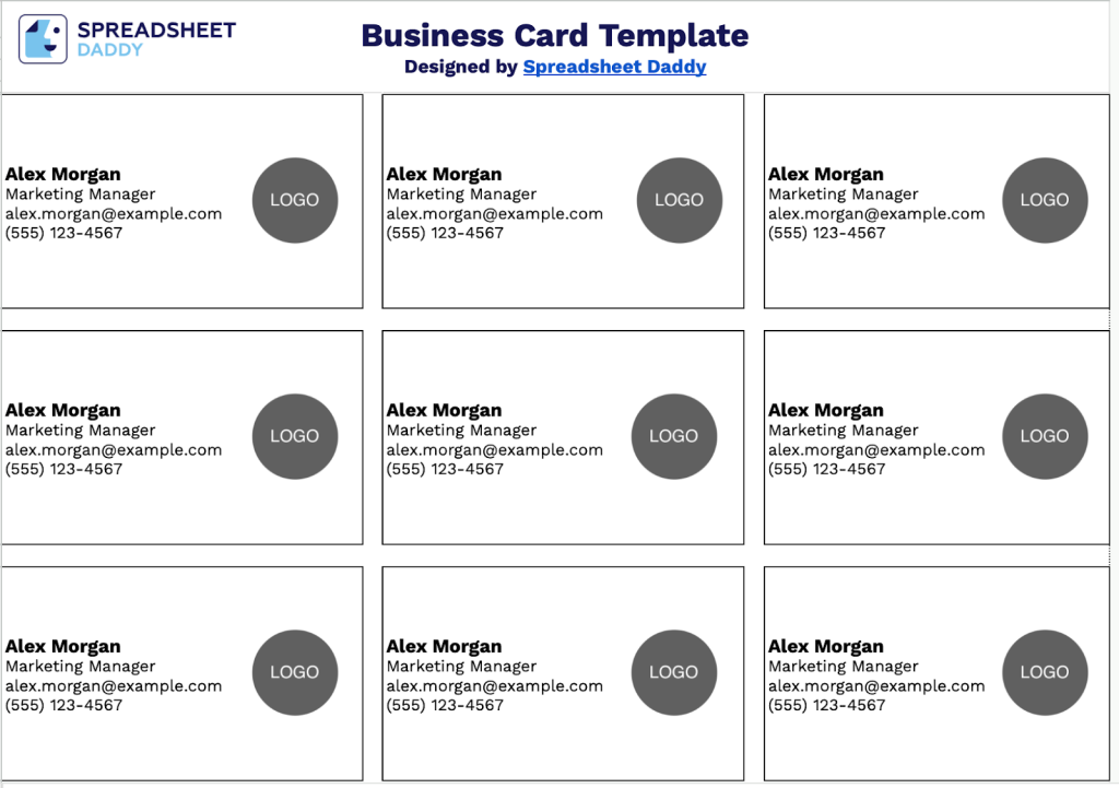 1. Use this Business Card template in Excel, PDF, or Google Sheets to create professional cards.