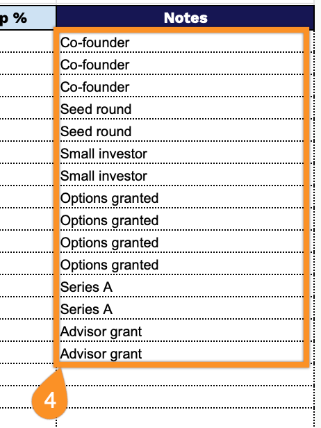 - Flexible Notes column: A dedicated Notes field accompanies each shareholder row, providing space to capture context such as vesting schedules, investment round details, convertible note terms, and other deal-specific information that doesn’t fit neatly into the structured columns.