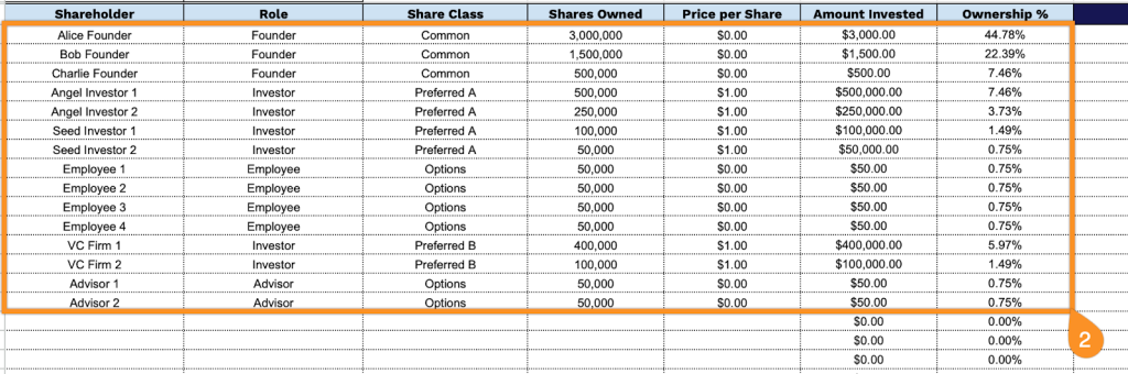 - Ownership %: The template calculates the columns automatically as the percentage of total outstanding shares held by each shareholder.