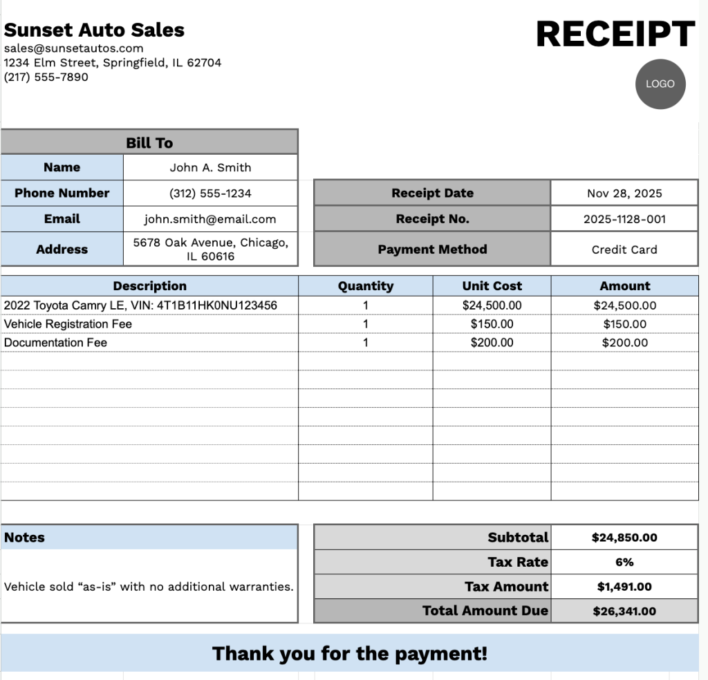 Free☝️ Car Sale Receipt Template (Google Sheets, Excel, Word, Google Docs, & PDF Downloads)