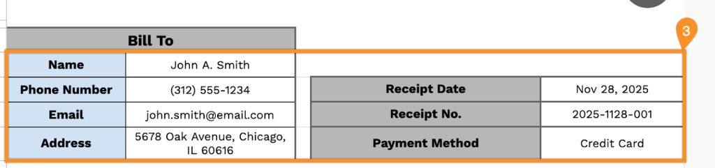 3. Fill in the buyer’s details under “Bill To,” along with the receipt date, receipt number, and payment method.