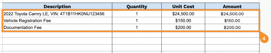 • Multi-row itemization table: A table with four columns (Description, Quantity, Unit Cost, and Amount) allows you to list the vehicle, optional add-ons, dealer fees, warranties, or any additional services, providing a clear breakdown of all sale components.