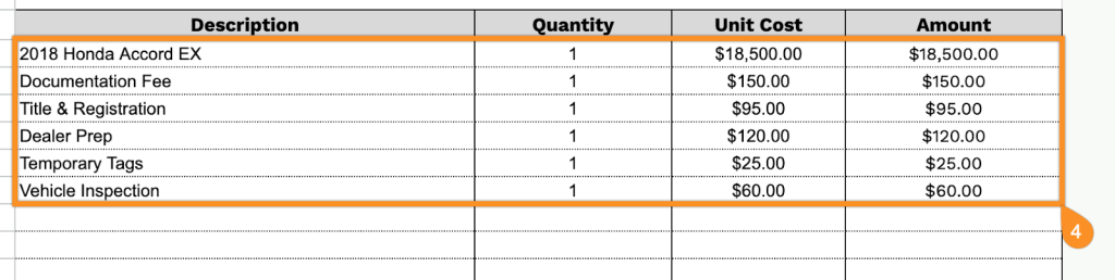 4. List the vehicles or car-related items sold. Include the quantity and unit price; the template will automatically calculate the line totals.