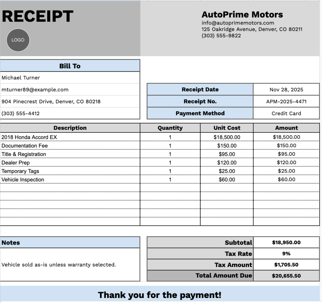 - Customizable business information fields: The header section includes editable placeholders for company name, email address, physical address, and phone number, allowing you to quickly brand the receipt with your dealership or business details for professional documentation.