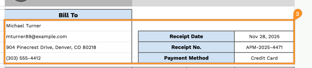 3. Fill in the buyer’s details under “Bill To,” along with the receipt date, receipt number, and payment method.