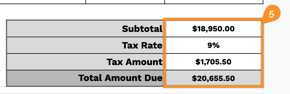 5. Enter the applicable tax rate, and the template will calculate the subtotal, tax amount, and total amount due.