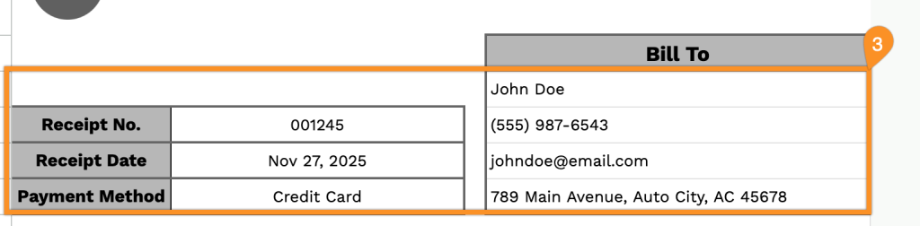 3. Enter your customer’s details in the Bill To section along with the receipt date, receipt number, and payment method.