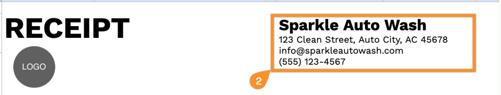 2. Add your car wash’s information at the top of the receipt. Include the business name, email, address, phone number, and logo so customers know who provided the service.