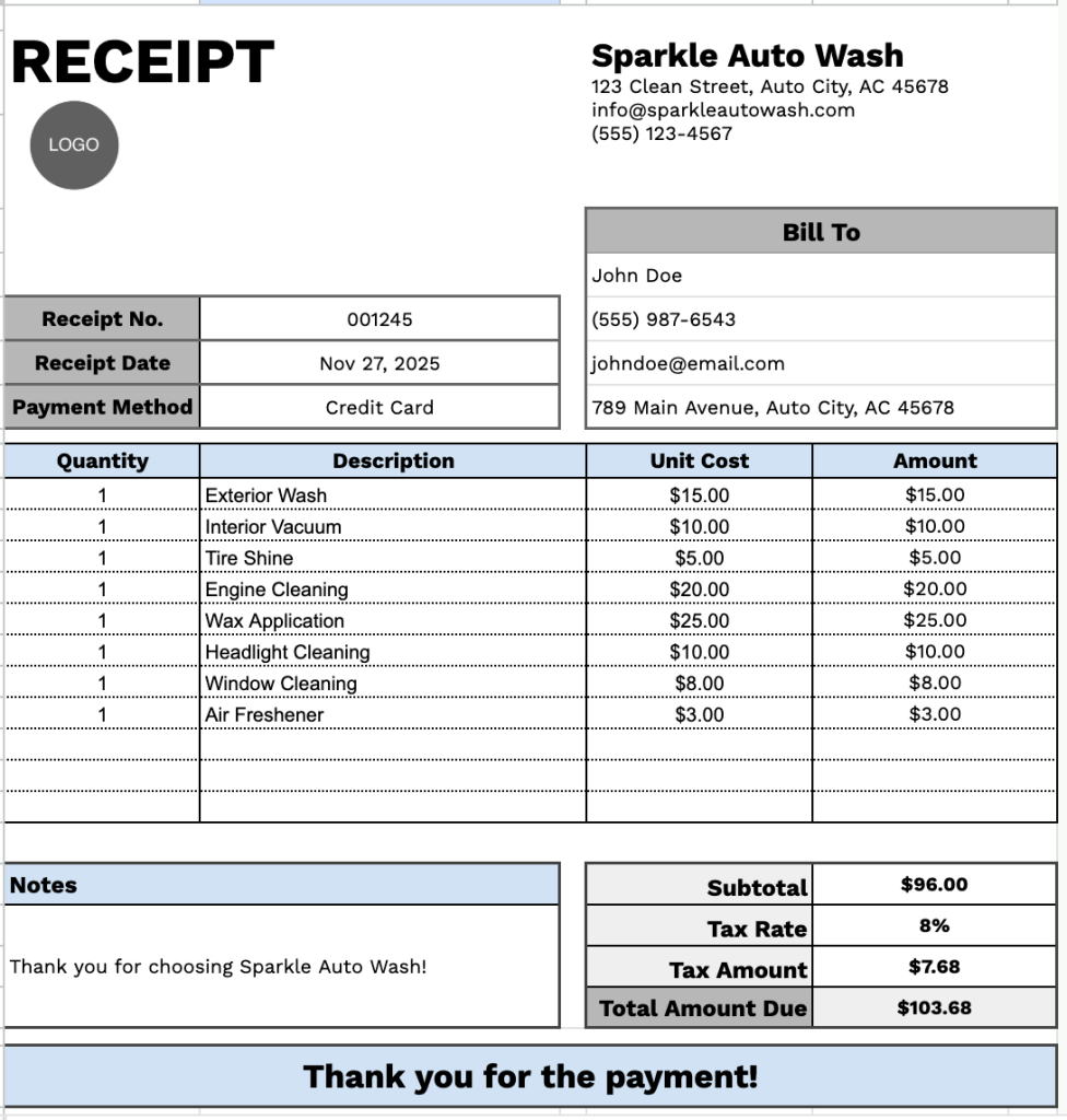 Free☝️ Car Wash Receipt Template (Google Sheets, Excel, Word, Google Docs, & PDF Downloads)