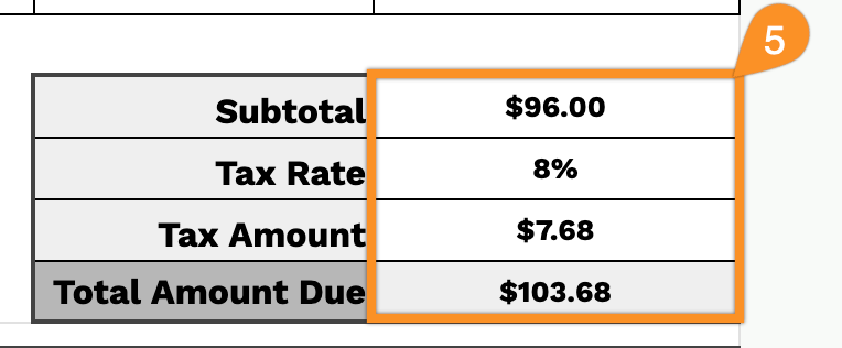 5. Add the appropriate tax rate. The template will calculate the subtotal, tax amount, and total amount due.