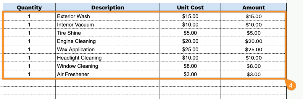• Multi-line itemized service table: A table organized into four columns (Quantity, Description, Unit Cost, and Amount) enables you to list multiple car wash services, such as basic wash, deluxe wash, interior cleaning, waxing, tire shine, or other add-ons, with individual quantities and pricing for transparent billing.