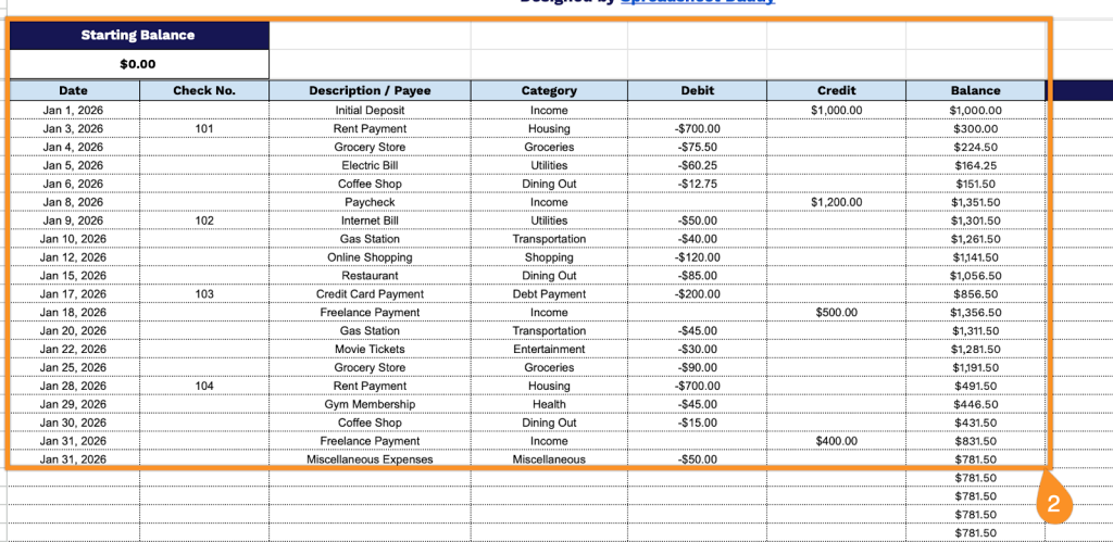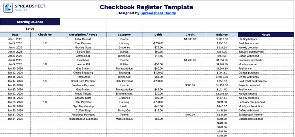 - Starting balance field: The header section includes an editable starting balance field that lets you enter your initial account balance before recording any transactions, ensuring accurate balance tracking throughout the register.