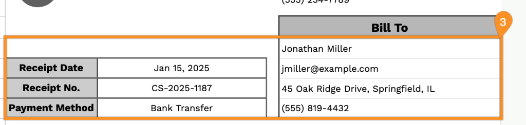 3. Complete the “Bill To” section with the recipient’s details, along with the receipt date, receipt number, and payment method.