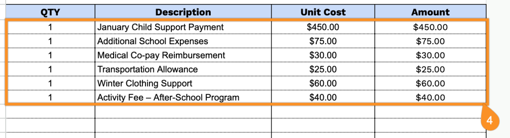 4. List the child support payments or related services provided. Include the quantity and the amount for each item; the template will automatically calculate the line totals.
